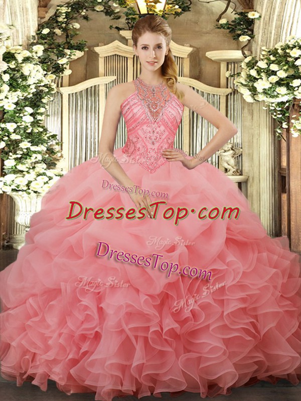 Fitting Floor Length Ball Gowns Sleeveless Watermelon Red 15th Birthday Dress Lace Up
