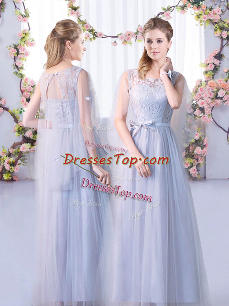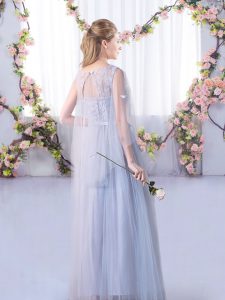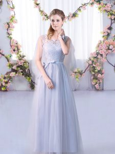 Fitting Floor Length Lace Up Quinceanera Dama Dress Grey for Wedding Party with Lace