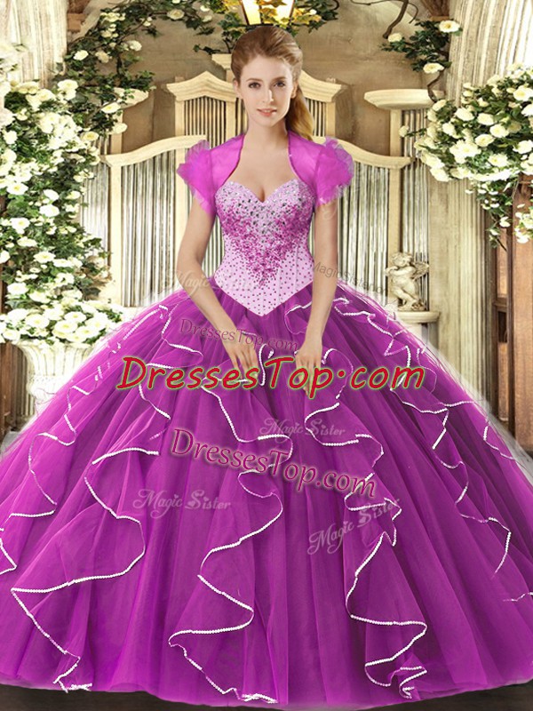 Fitting Fuchsia Ball Gowns Beading Sweet 16 Quinceanera Dress Lace Up Tulle Sleeveless Floor Length