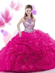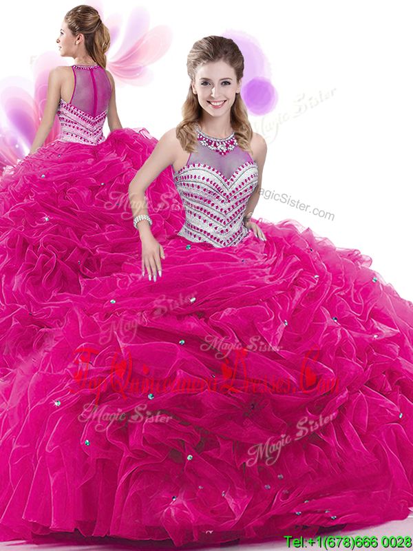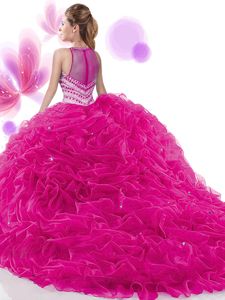 Fitting Fuchsia Sleeveless Ruffles and Pick Ups Zipper Quince Ball Gowns