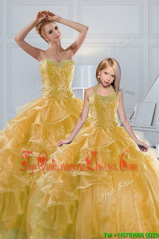 Fitting Gold Sleeveless Beading and Ruffled Layers Floor Length Vestidos de Quinceanera