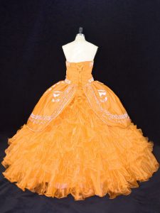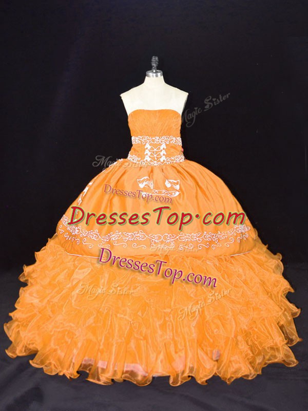 Fitting Gold Strapless Lace Up Embroidery and Ruffles Quinceanera Dress Sleeveless