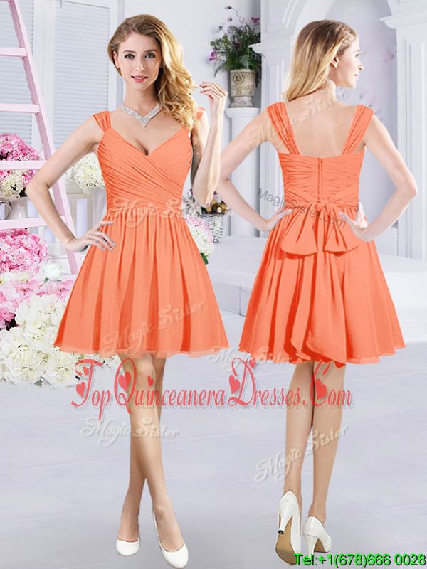 Fitting Mini Length Zipper Quinceanera Dama Dress Orange and In for Prom and Party and Wedding Party with Ruching and Belt