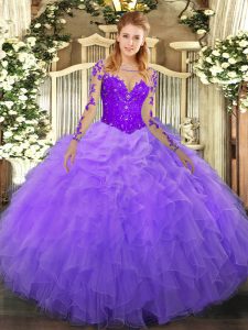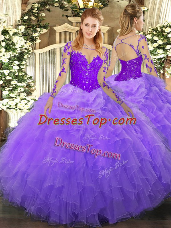 Fitting Organza Scoop Long Sleeves Lace Up Lace and Ruffles Ball Gown Prom Dress in Lavender