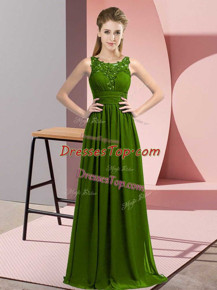 Fitting Scoop Sleeveless Damas Dress Floor Length Beading and Appliques Olive Green Chiffon