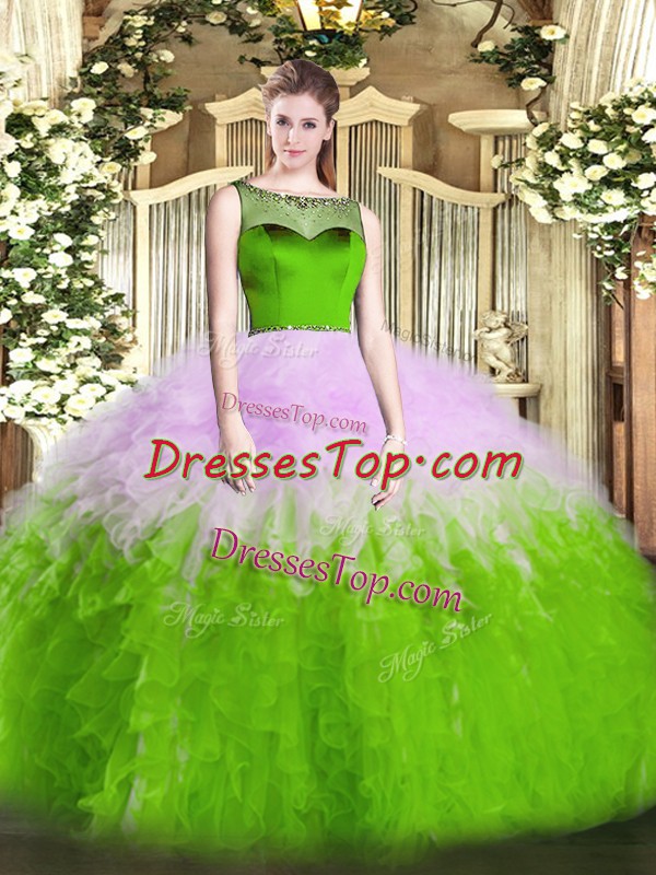 Fitting Scoop Sleeveless Quinceanera Dress Floor Length Beading and Ruffles Multi-color Tulle