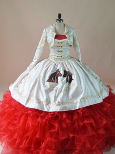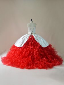 Fitting White And Red Ball Gowns Satin and Organza Strapless Sleeveless Embroidery and Ruffles Floor Length Lace Up Quinceanera Gowns Brush Train