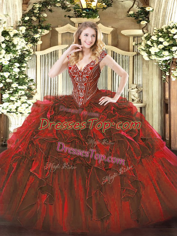 Fitting Wine Red Ball Gowns Organza V-neck Sleeveless Beading and Ruffles Floor Length Lace Up Vestidos de Quinceanera
