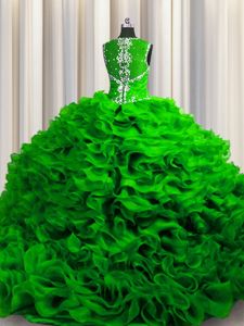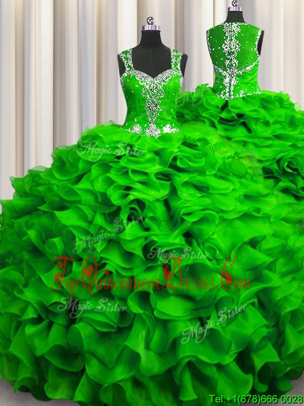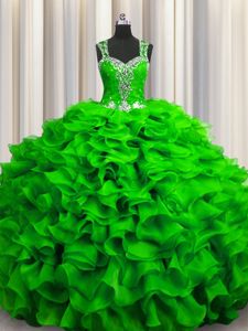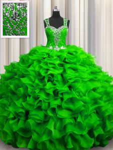 Fitting Zipple Up See Through Back Straps Sleeveless Organza Quinceanera Dresses Beading and Ruffles Zipper