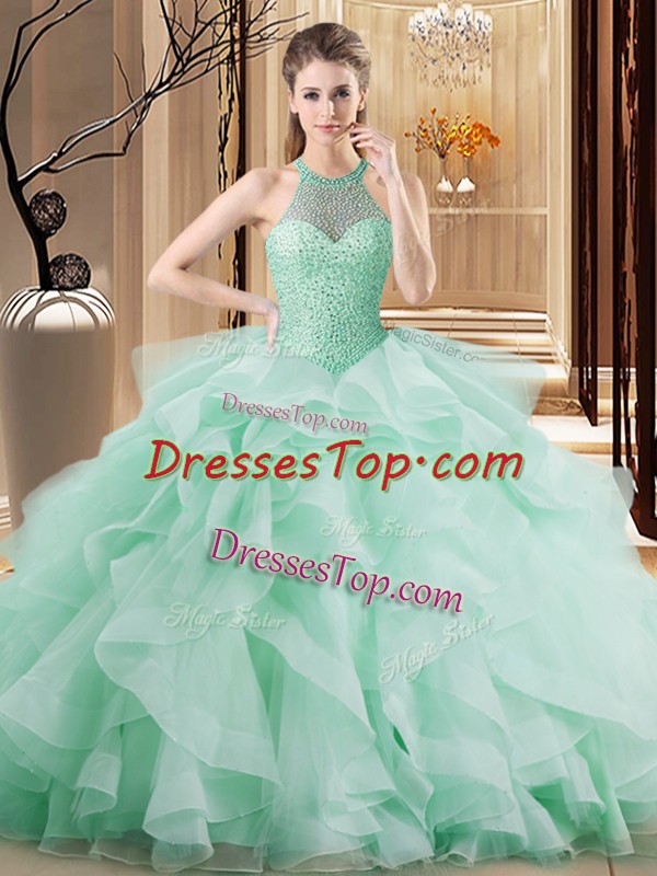 Flare Apple Green Halter Top Neckline Beading and Ruffles Sweet 16 Dress Sleeveless Lace Up