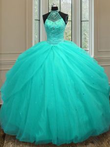 Flare Aqua Blue Ball Gowns Halter Top Sleeveless Tulle Floor Length Lace Up Beading Sweet 16 Dress