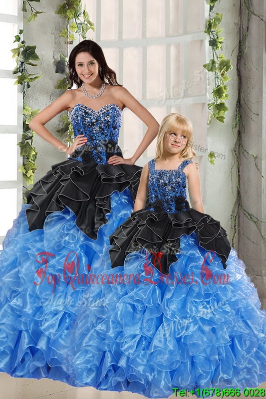 Flare Black and Blue Sleeveless Floor Length Beading and Ruffles Lace Up Sweet 16 Dresses