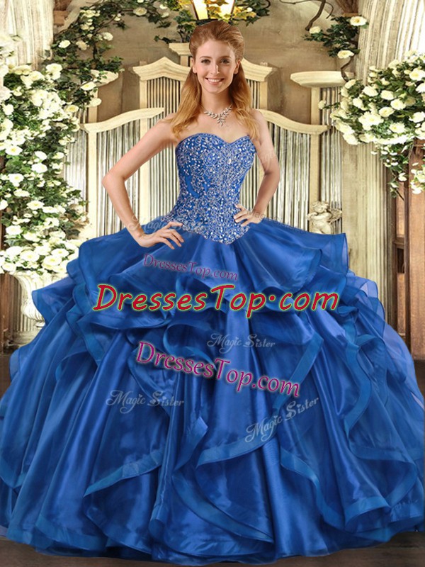 Flare Blue Sleeveless Floor Length Beading and Ruffles Lace Up Quinceanera Dresses