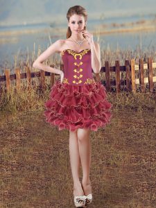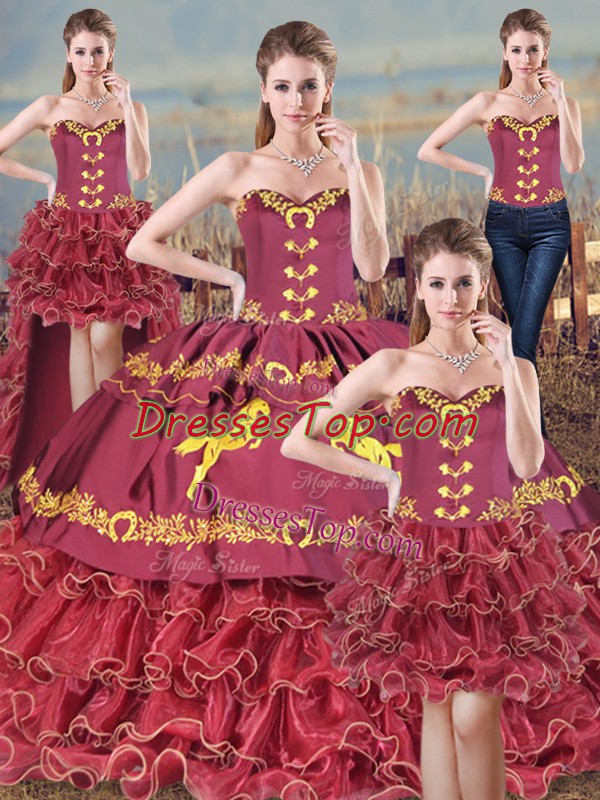 Flare Burgundy Quinceanera Gown Sweet 16 and Quinceanera with Embroidery Sweetheart Sleeveless Brush Train Lace Up