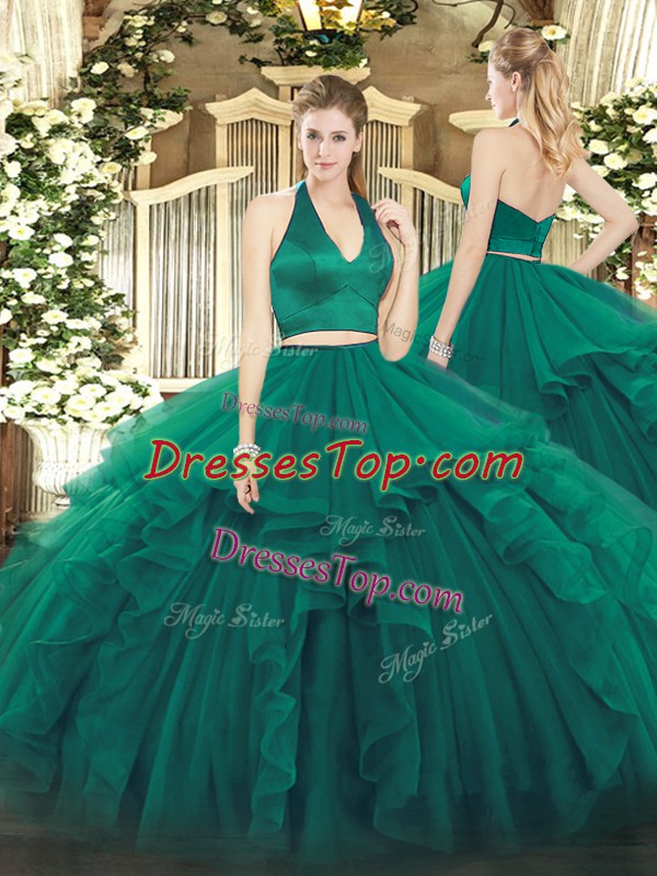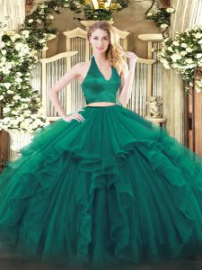 Flare Dark Green Quinceanera Gown Military Ball and Sweet 16 and Quinceanera with Ruffles Halter Top Sleeveless Zipper