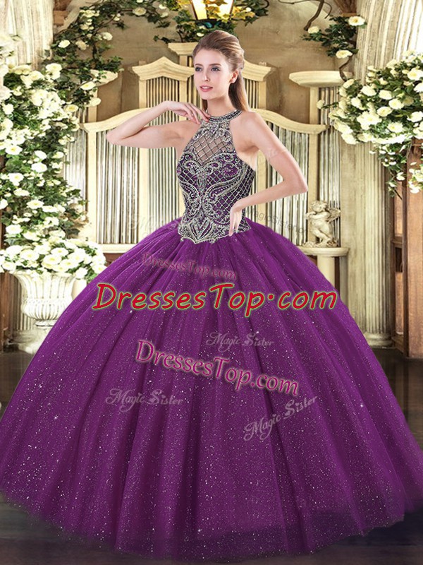 Flare Eggplant Purple Halter Top Neckline Beading Quinceanera Dress Sleeveless Lace Up