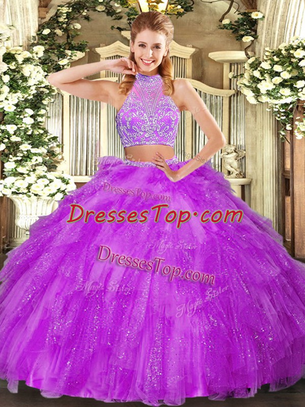 Flare Fuchsia Halter Top Criss Cross Beading and Ruffles Quinceanera Gowns Sleeveless