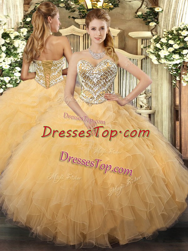 Flare Gold Ball Gowns Beading and Ruffles Quince Ball Gowns Lace Up Tulle Sleeveless Floor Length
