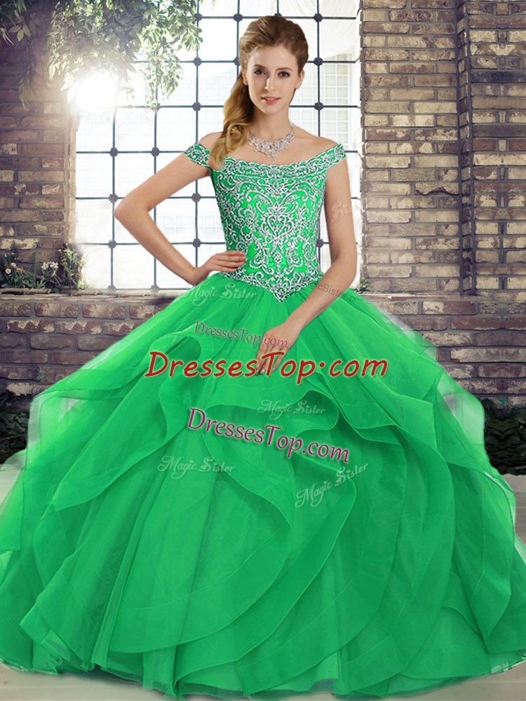 Flare Green Ball Gowns Beading and Ruffles 15 Quinceanera Dress Lace Up Tulle Sleeveless