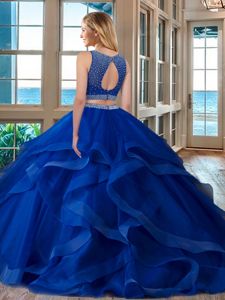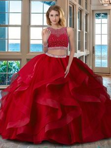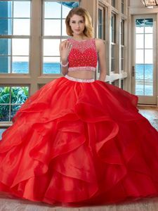 Flare Organza Scoop Sleeveless Zipper Beading 15 Quinceanera Dress in Red