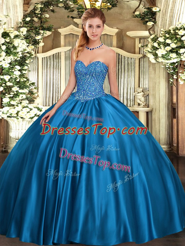 Flare Sleeveless Satin Floor Length Lace Up Ball Gown Prom Dress in Blue with Beading