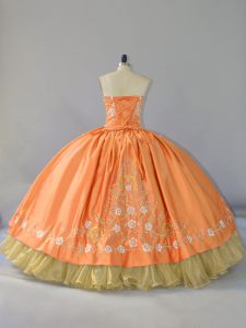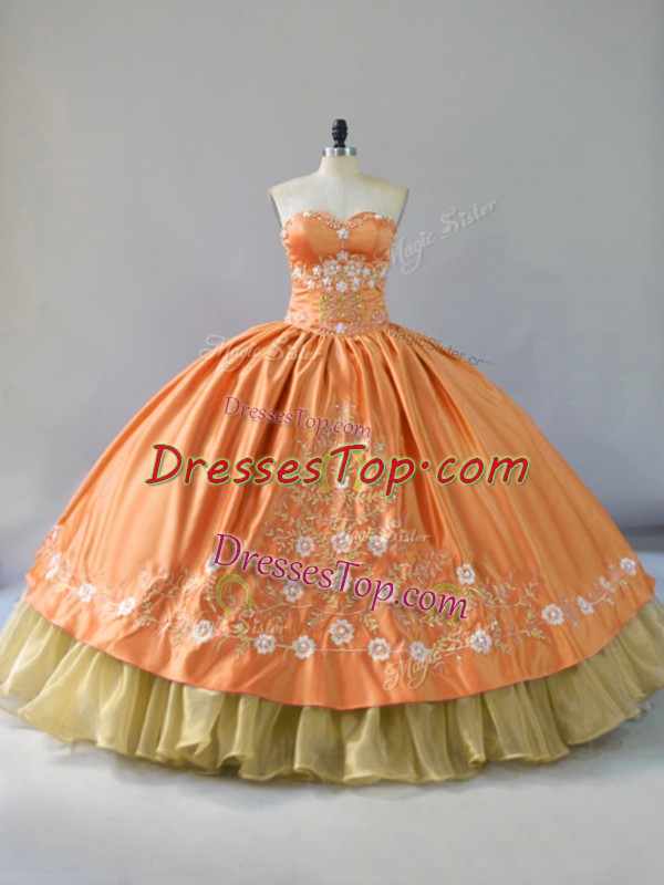 Flare Sweetheart Sleeveless Quinceanera Dresses Floor Length Embroidery and Ruffled Layers Orange Satin and Organza