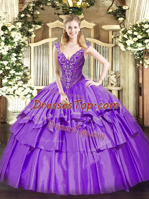 Flare V-neck Sleeveless Organza and Taffeta Sweet 16 Dress Beading and Ruffled Layers Lace Up