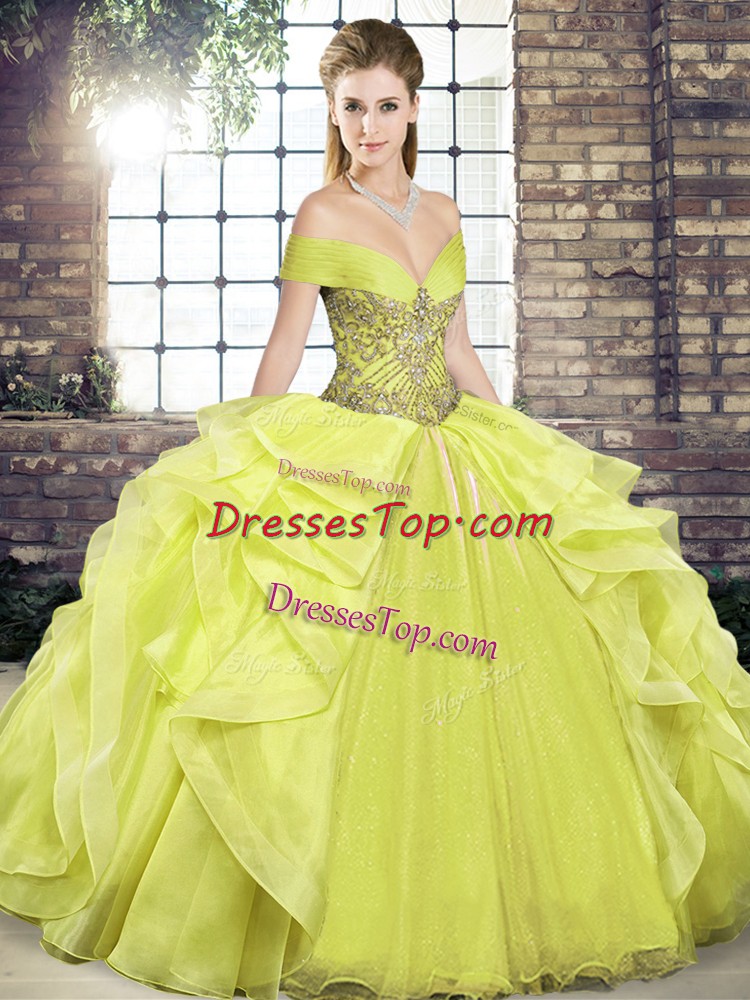 Flare Yellow Off The Shoulder Lace Up Beading and Ruffles Quince Ball Gowns Sleeveless