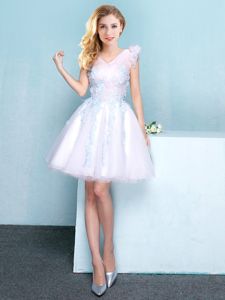 Flirting A-line Dama Dress White V-neck Tulle Sleeveless Mini Length Lace Up