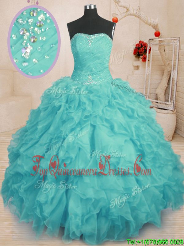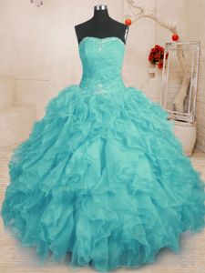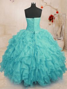 Flirting Aqua Blue Sleeveless Organza Lace Up Quince Ball Gowns for Military Ball and Sweet 16 and Quinceanera