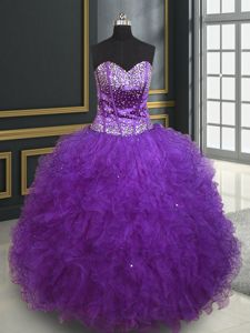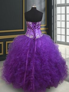 Flirting Eggplant Purple Lace Up 15 Quinceanera Dress Beading and Ruffles Sleeveless Floor Length