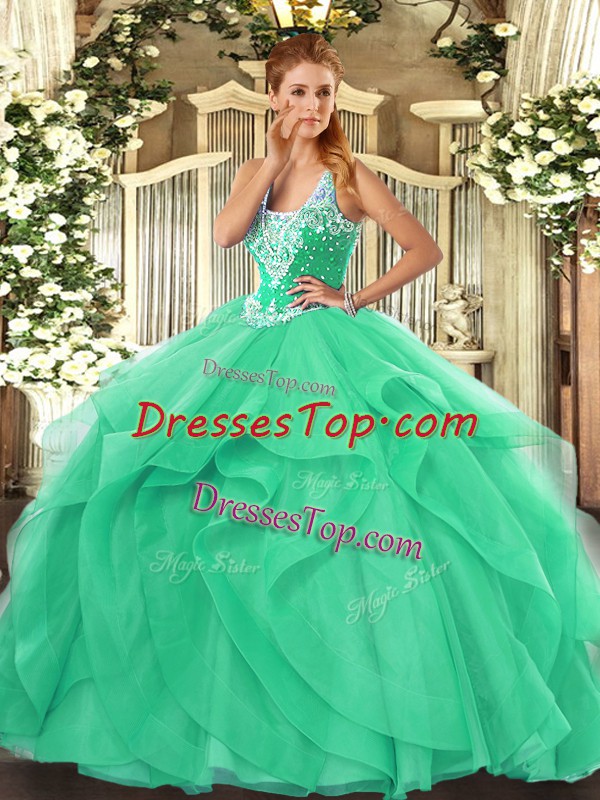 Turquoise Sleeveless Floor Length Beading and Ruffles Lace Up Sweet 16 Quinceanera Dress