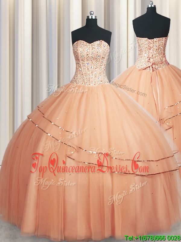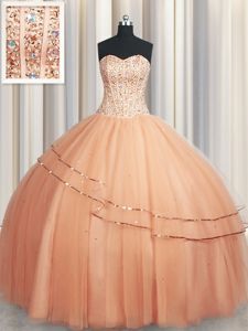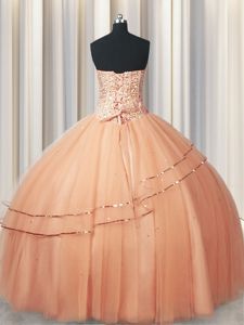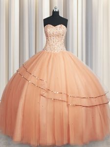 Flirting Floor Length Rust Red Sweet 16 Dress Tulle Sleeveless Beading and Appliques