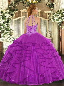 Flirting Fuchsia Halter Top Neckline Beading and Ruffles Quinceanera Dresses Sleeveless Lace Up