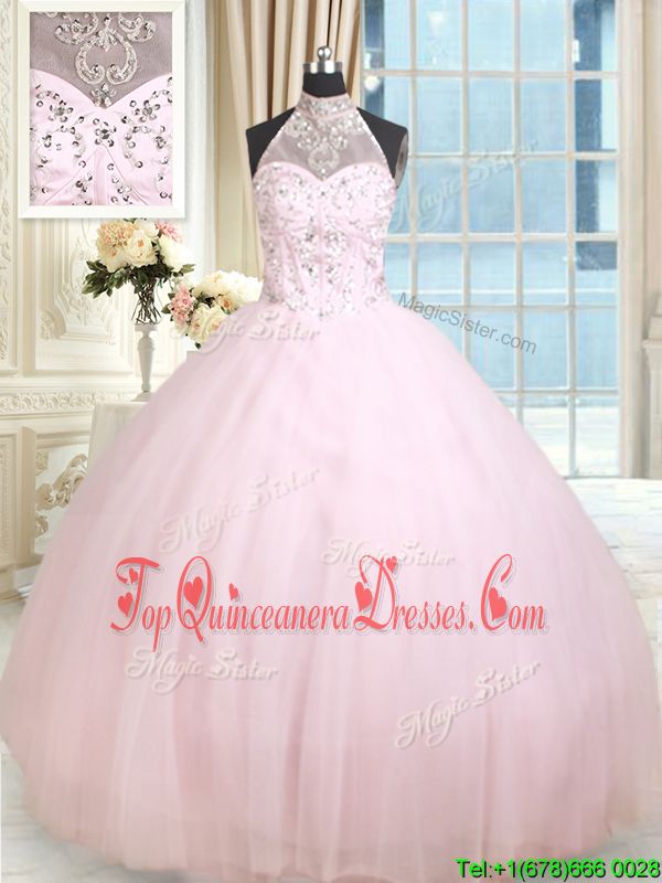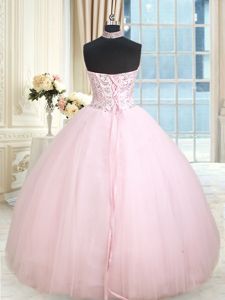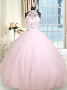Flirting Halter Top Sleeveless Tulle Floor Length Lace Up Quinceanera Gowns in Baby Pink for with Beading