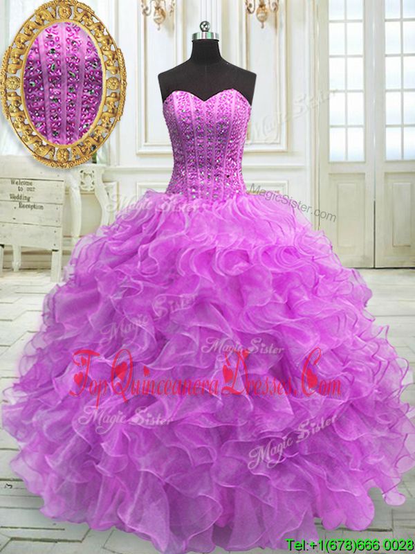 Flirting Lilac Organza Lace Up Quinceanera Dresses Sleeveless Floor Length Beading and Ruffles