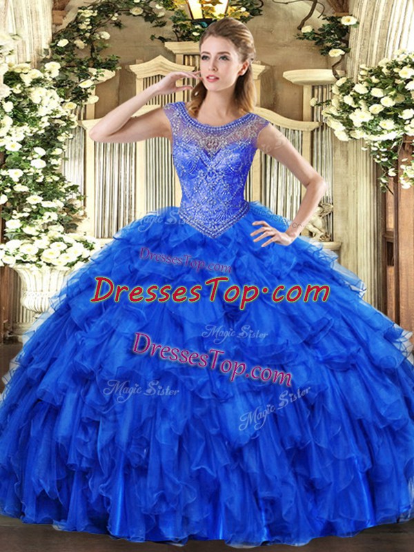 Flirting Scoop Sleeveless 15th Birthday Dress Floor Length Beading and Ruffles Royal Blue Organza