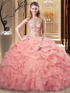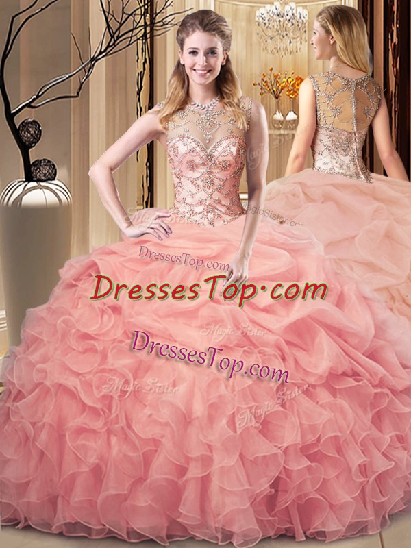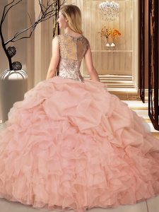 Flirting Scoop Sleeveless Quinceanera Gowns Floor Length Beading and Ruffles Peach Organza
