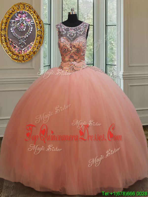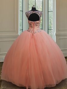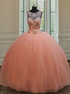Flirting Sequins Ball Gowns Quinceanera Dresses Peach Scoop Tulle Sleeveless Floor Length Lace Up