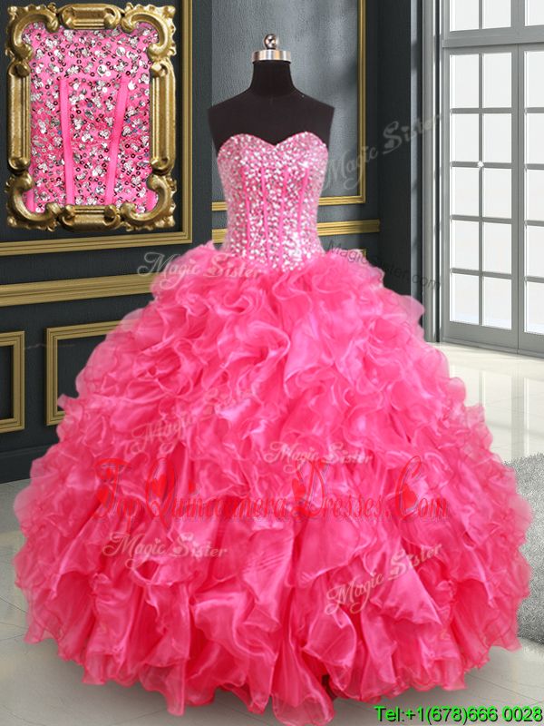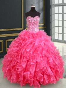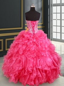 Flirting Sleeveless Organza Floor Length Lace Up Quinceanera Gown in Hot Pink for with Beading and Ruffles and Sequins