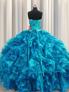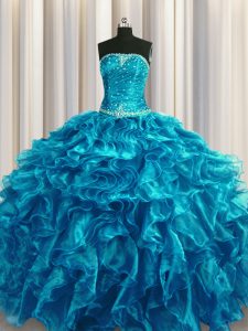 Flirting Strapless Sleeveless Quinceanera Gowns Floor Length Beading and Ruffles Teal Organza