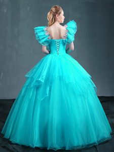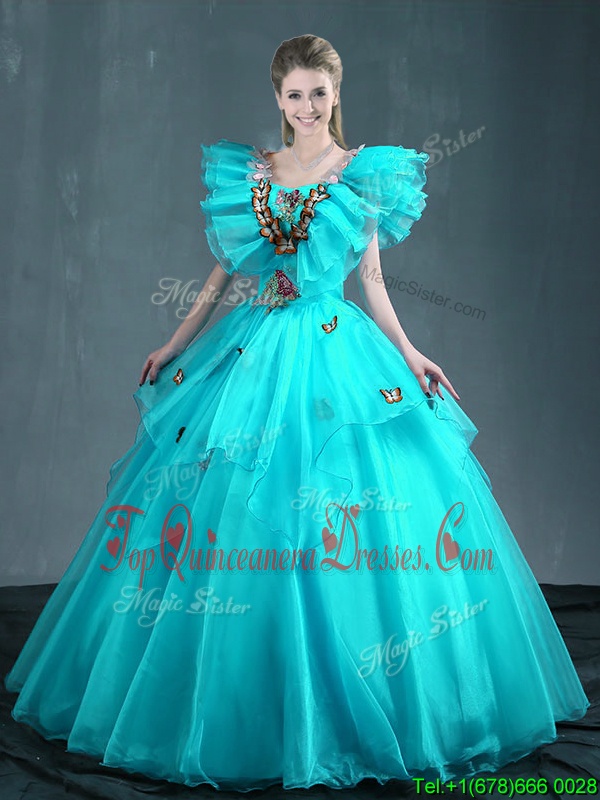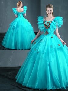 Floor Length Aqua Blue 15 Quinceanera Dress Organza Sleeveless Embroidery