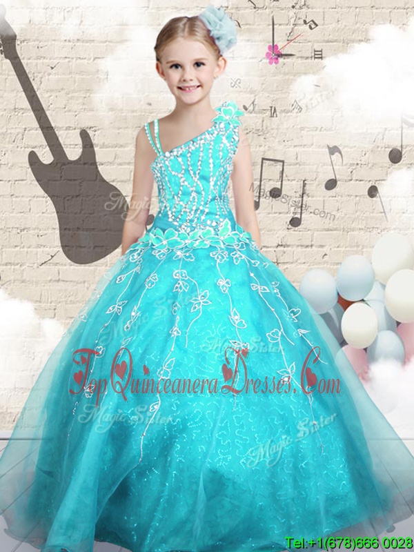 Floor Length Aqua Blue High School Pageant Dress Tulle Sleeveless Appliques