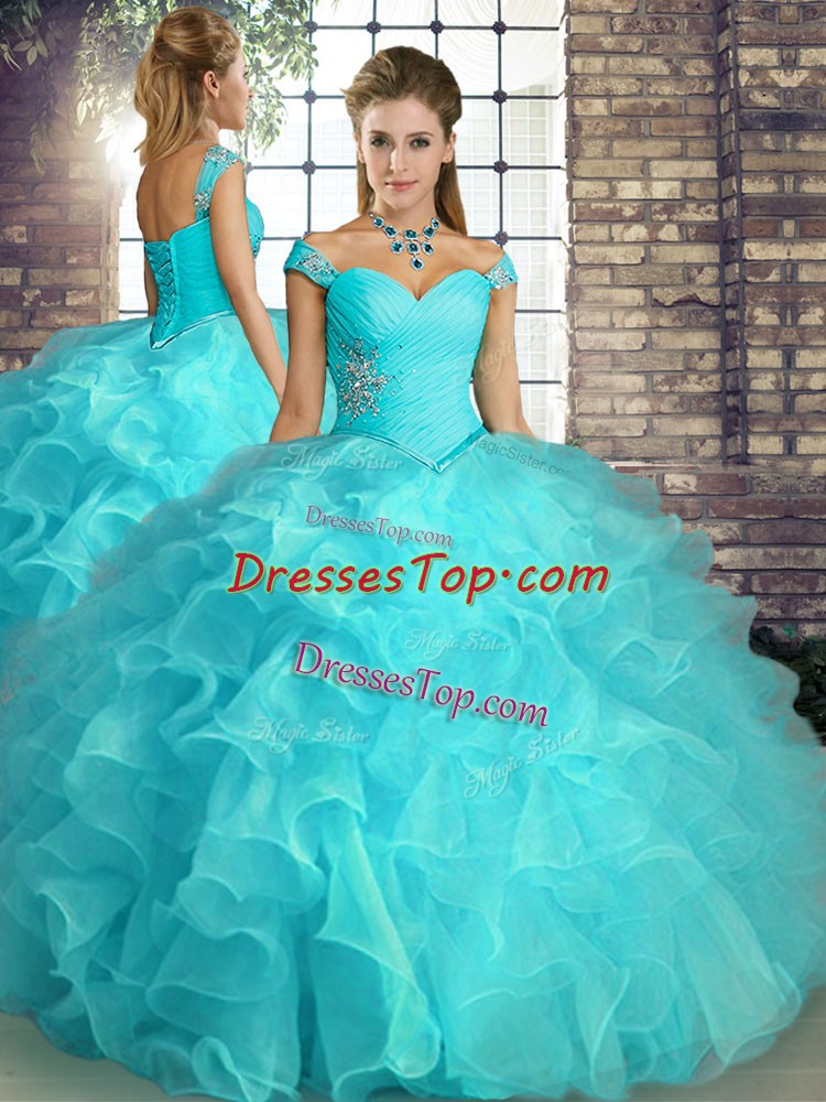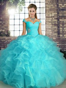 Floor Length Aqua Blue Quinceanera Gowns Organza Sleeveless Beading and Ruffles