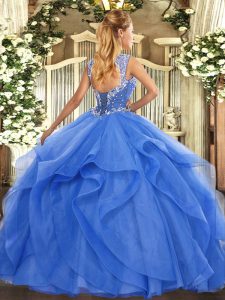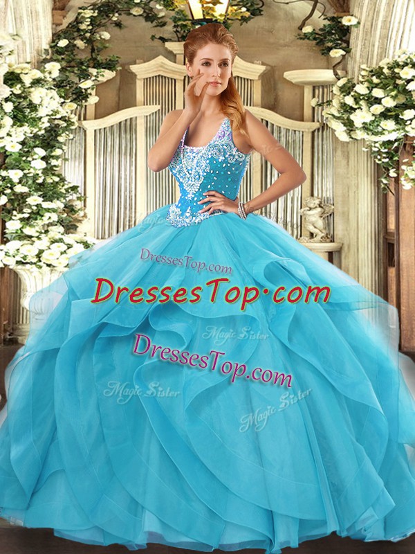 Floor Length Aqua Blue Sweet 16 Dresses Tulle Sleeveless Beading and Ruffles