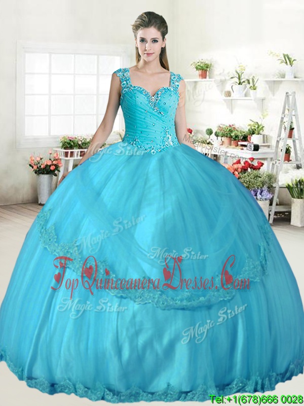 Floor Length Aqua Blue Sweet 16 Quinceanera Dress Straps Sleeveless Lace Up
