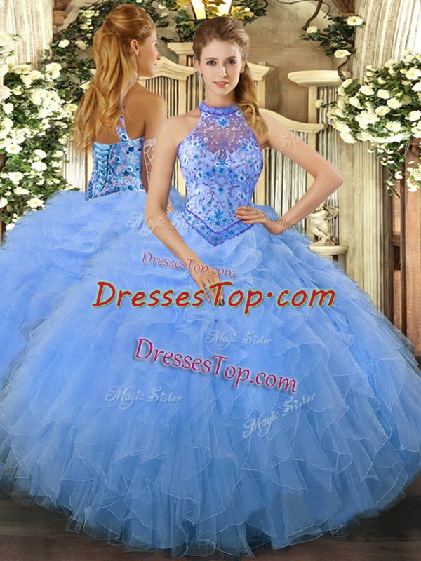 Floor Length Baby Blue Ball Gown Prom Dress Halter Top Sleeveless Lace Up