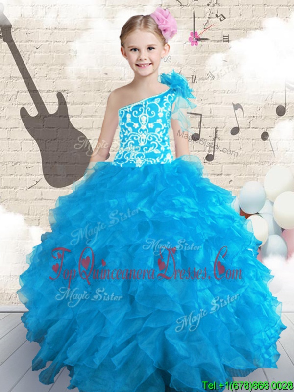 Floor Length Baby Blue Pageant Gowns For Girls One Shoulder Sleeveless Lace Up