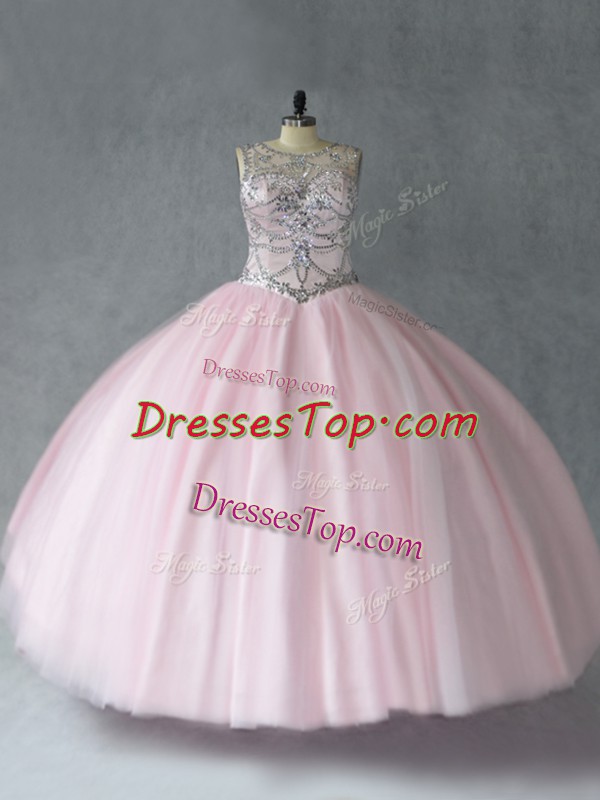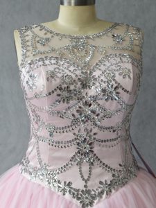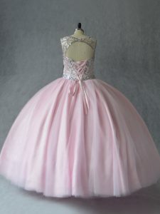 Floor Length Baby Pink Ball Gown Prom Dress Scoop Sleeveless Lace Up