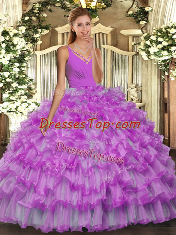Floor Length Backless 15th Birthday Dress Lilac for Sweet 16 and Quinceanera with Beading and Ruffles